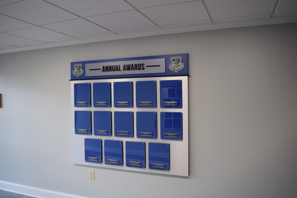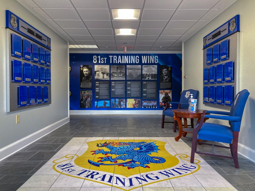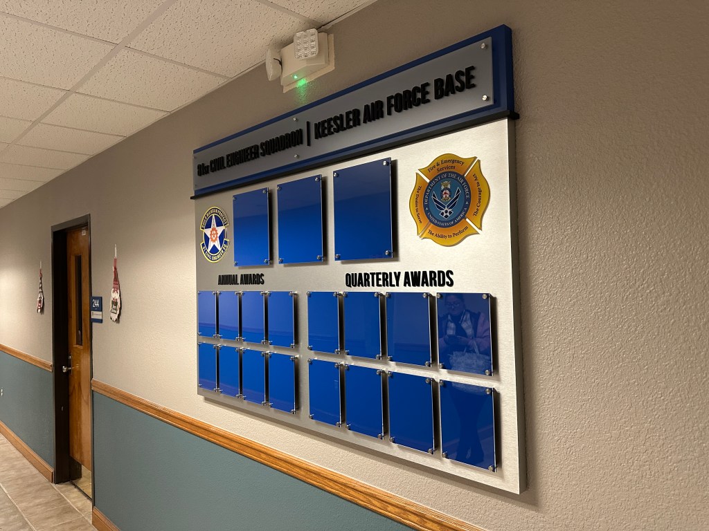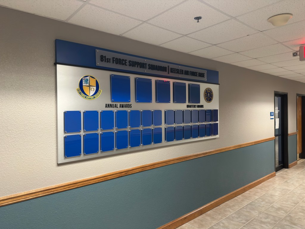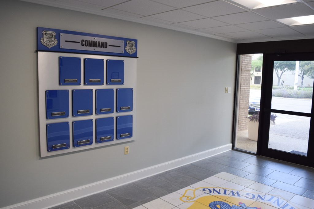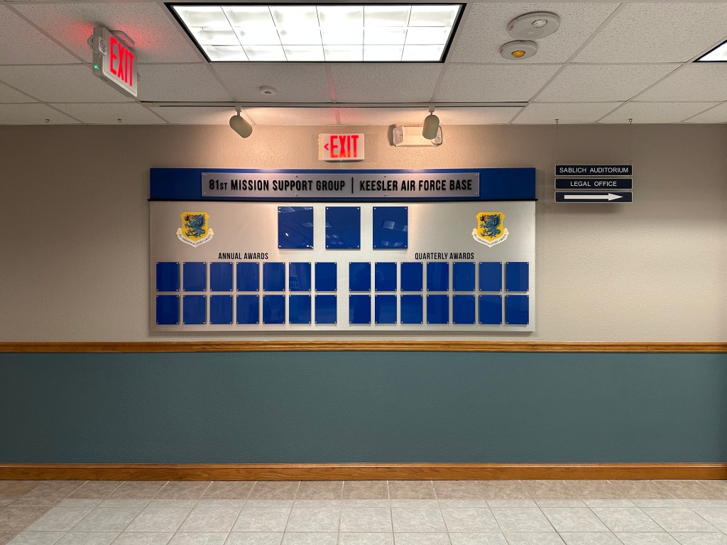 Located on the Mississippi Gulf Coast, the Keesler Air Force Base 81st Training Wing is a lead Joint Training Installation. Instructing not only Air Force, but Army, Navy, Marine Corps, Coast Guard and civilian federal agency personnel. With so many people on base, they needed a sleek way to display their annual awards. They also wanted their chain of command to be easily visible. The photo frames are easy to change standoff-style photo frames, with changeable headers if they ever need to adjust verbiage.