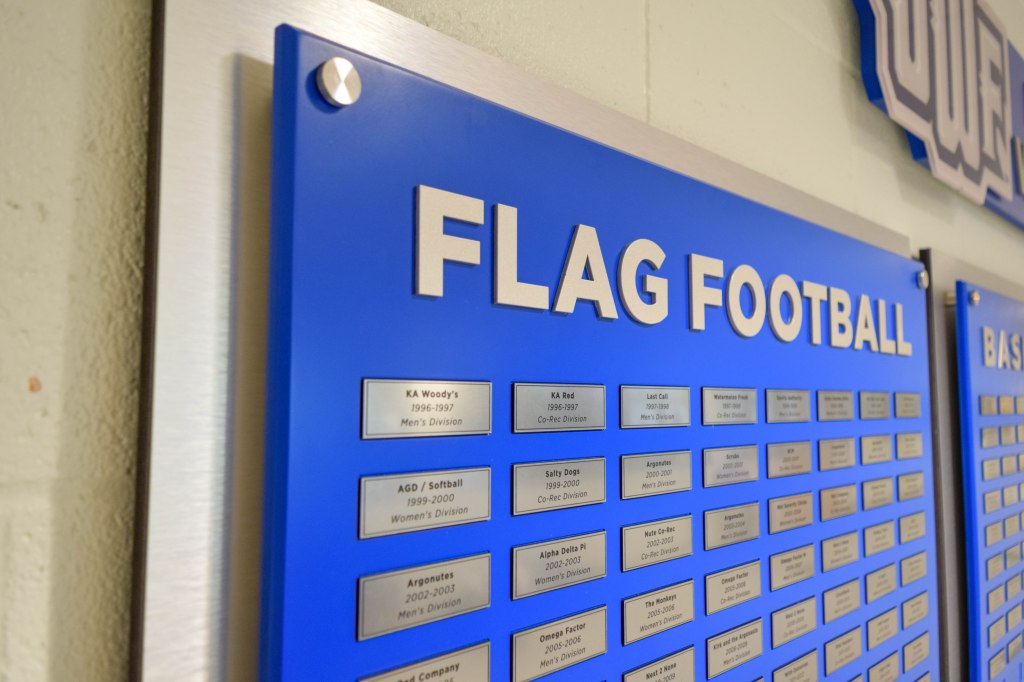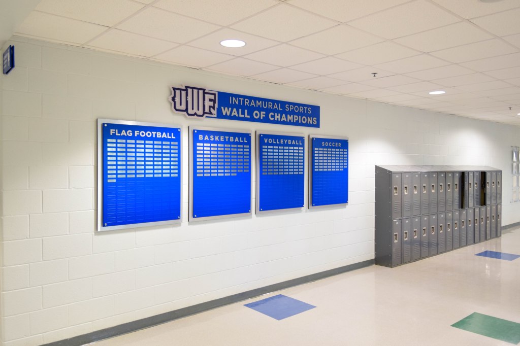 The University of West Florida wanted a way to honor their past Intramural Sports Champions and Hall of Fame recipients. With expandibility and annual additions in mind, we devised this sleek display to last UWF for years to come.